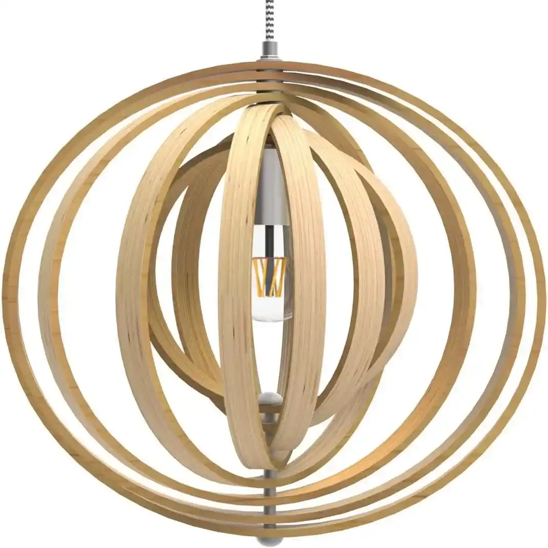 Le luminaire suspendu en bois est accompagné d’une ampoule LED E27 de 8W, diffusant une lumière douce et agréable. Elle est également compatible avec des ampoules incandescentes (jusqu’à 60W) pour une personnalisation de l’éclairage.